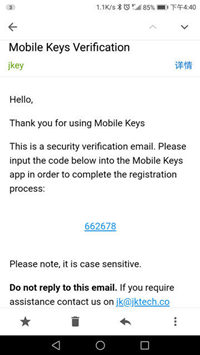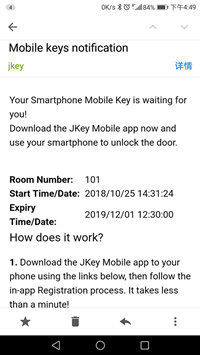 If the mobile key is released by locking management software, you will receive an notification email as illustration.For instance, mobile key of room 101 is released and valid time of the key is shown in the email as well.